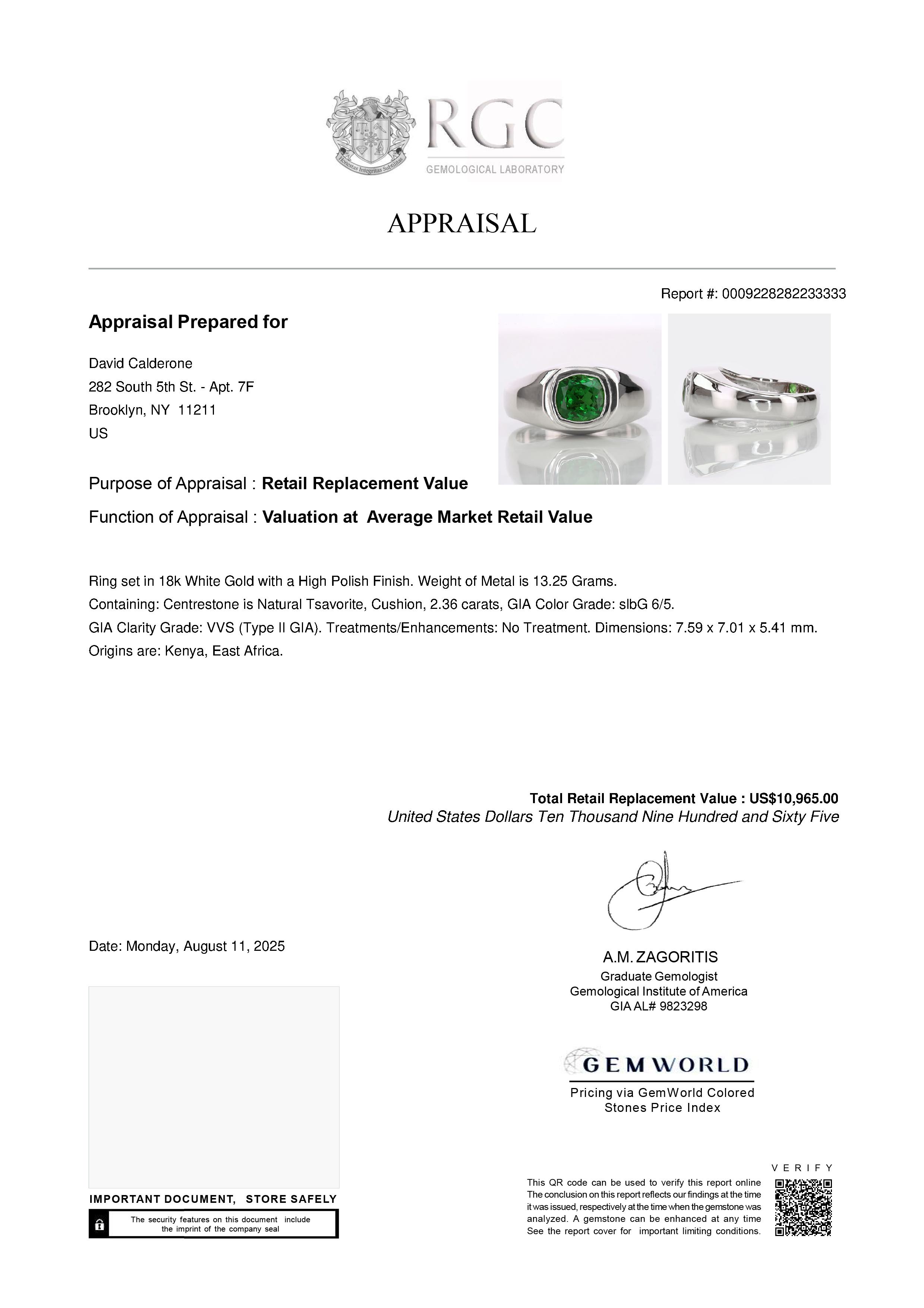 The center stone in this beautiful piece is a 2.36 Carats Tsavorite but it weighed 1.472 Grams in its rough state. The photograph here is the photographic log of it before we cut it. We include a full Mining and Geology Report with the piece when it ships so that you have a full genealogy for your unique Ring.