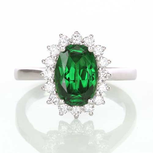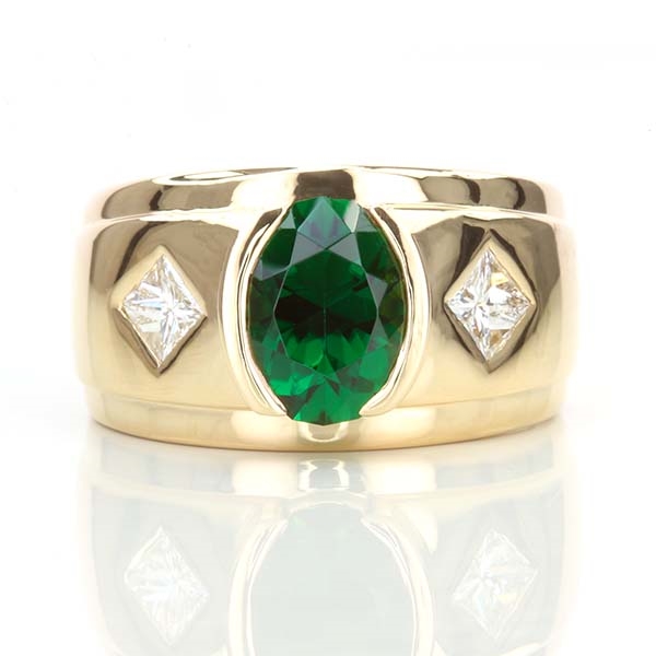 A sight to behold, this exceptional oval cut Chrome Tourmaline exudes a unique combination of brilliance and beauty. Set vertically with a half bezel on a wide polished 18k yellow gold band. Precise placement of flush set princess cut Diamond accents, accentuates sparkle to complete this statement piece.